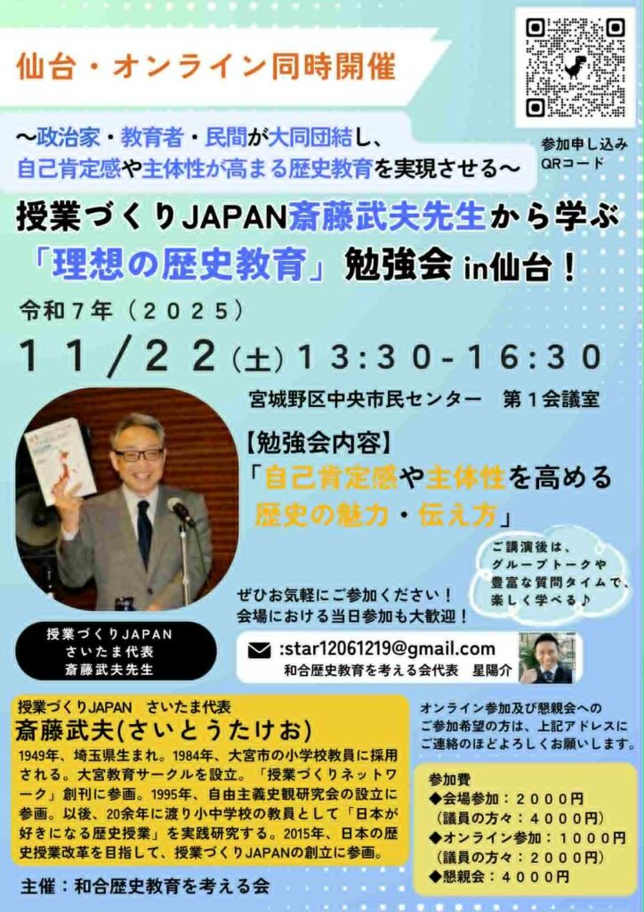 星陽介さんにお招きいただいて「理想の歴史教育勉強会in仙台」でお話することになりました。